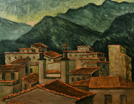Enid Fearnside (1896-1985) British, a view of Continental rooftops with mountains beyond, oil on canvas, 16" x 20".