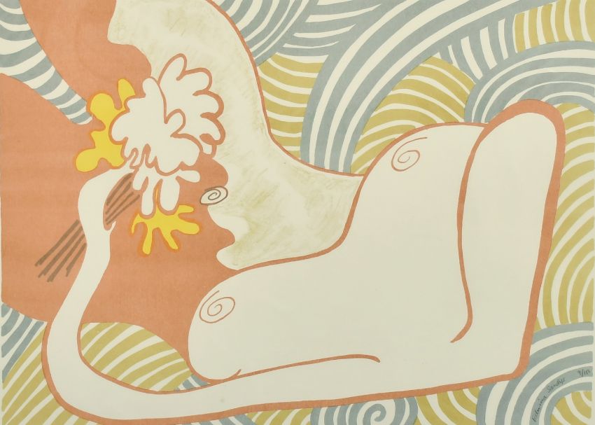 Edwina Sandys (b. 1938) British, a reclining female nude with flowers, colour print, signed and numbered 9/100 in pencil, 16" x 23".