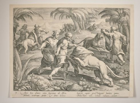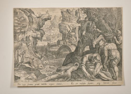 After Stradanus, an Old Master engraving of 'Swimmers Capturing the Nile Crocodiles', along with five other similar works after Stradanus, one engraved by Francesco Valegio, all around 8" x 11", (6) (unframed).