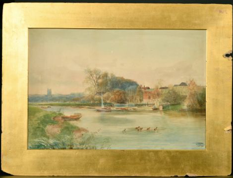 Henry Charles Fox (b.1860) British, A view across a river with buildings and a church beyond, watercolour, signed and dated '97, 15" x 21", (unframed).