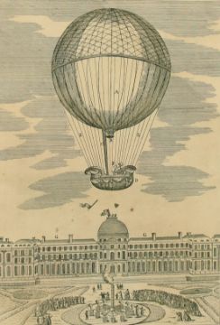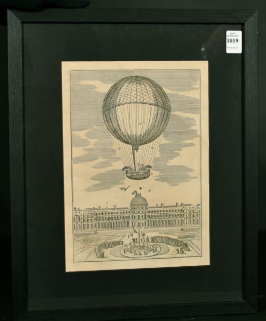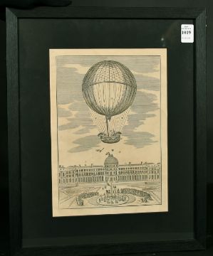 An engraving of an early balloon flight, 11" x 8".