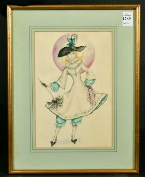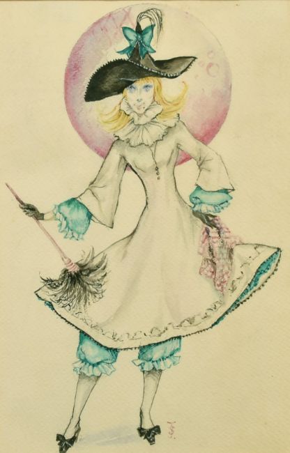 20th Century School, a study for a costume design, a female figure standing before a moon, watercolour, signed with monogram JS, 9.5" x 6.25".