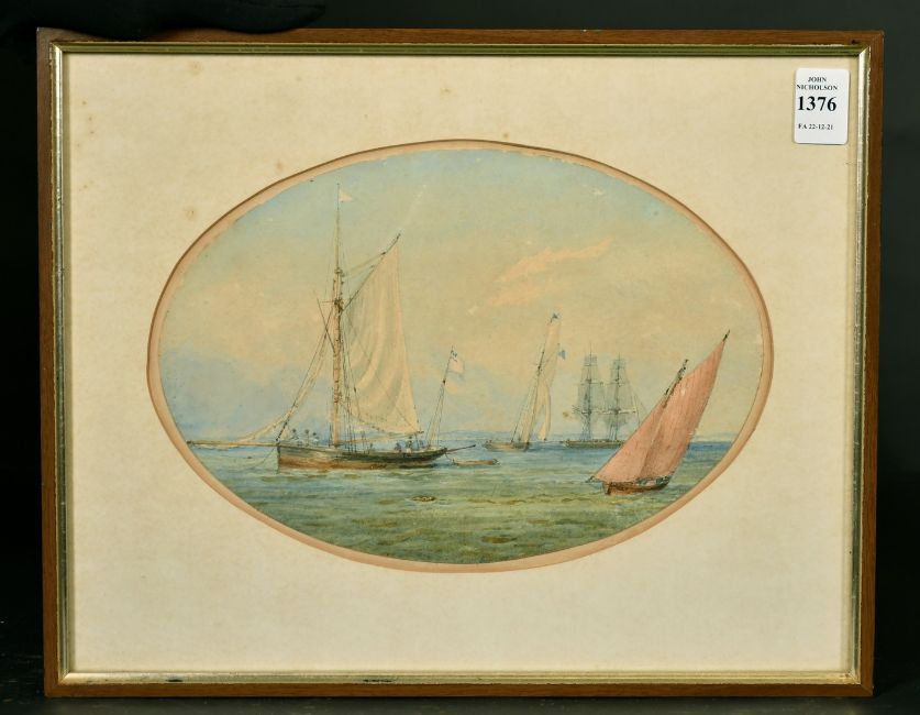 Admiral Sir Charles Burrard (1793-1870) British, A maritime scene with boats on calm waters, watercolour, inscribed verso, 7" x 10", (oval).