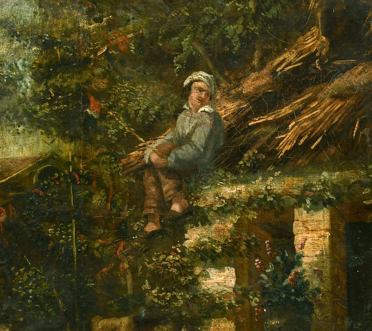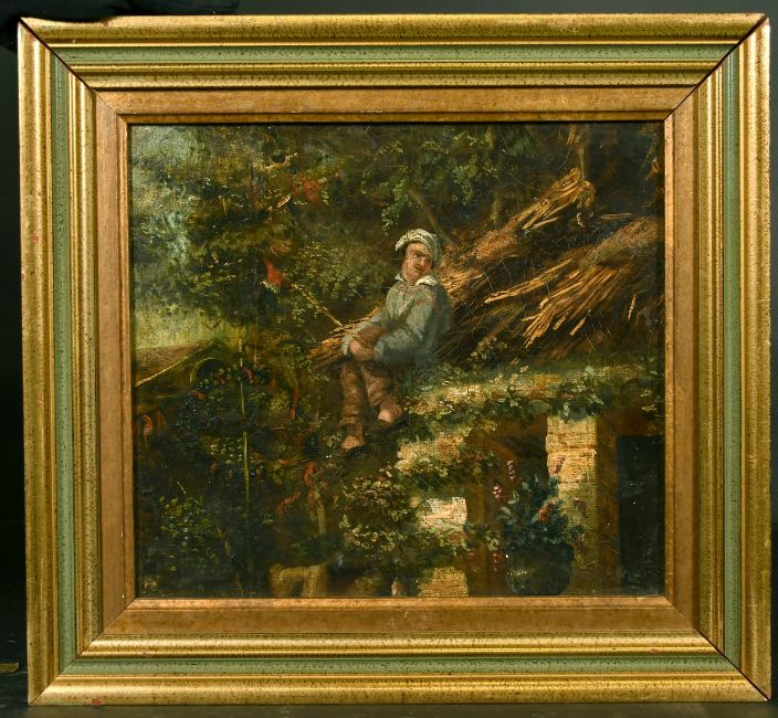 19th Century Continental School, A scene of a figure on a roof surrounded by foliage, oil on canvas laid down, 11" x 12.5".