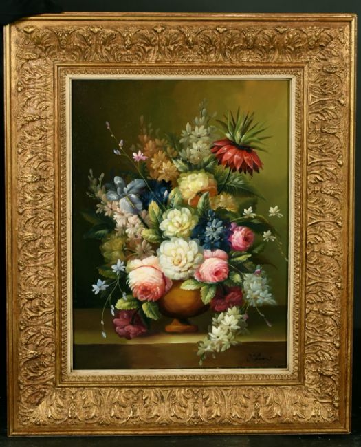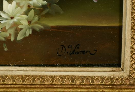 D. Warren (20th Century), a still life of mixed flowers on a marble ledge, oil on board, signed, 16" x 12".