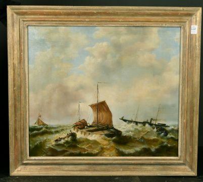 H. Marris? (20th Century), fishing boats and a paddle steamer in choppy seas, oil on canvas, signed, 20" x 24".