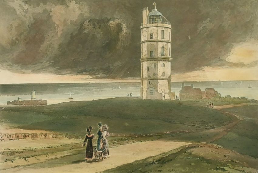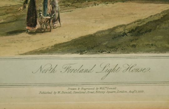 William Daniel (1769-1837) British, 'North Foreland Light House', hand coloured aquatint, 9" x 12", in a maple veneered frame.