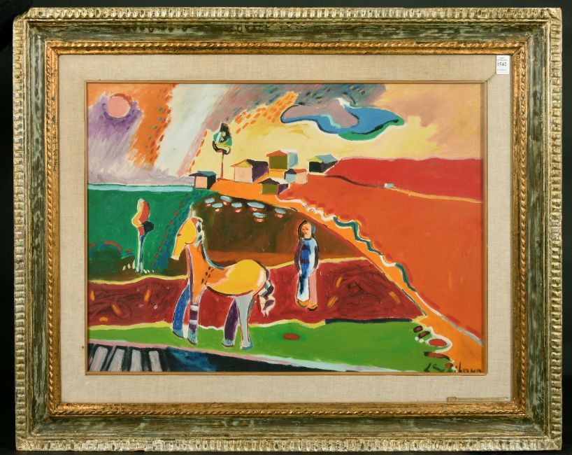 Luciano Schifano (b.1943) Italian, Paesaggio Campestre, figure and a horse in a colourful landscape, oil on canvas, 19.75" x 27.5".