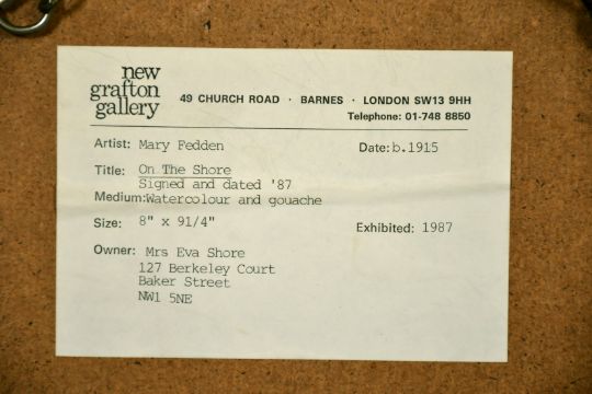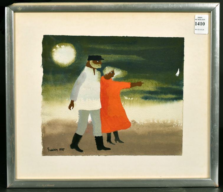 Mary Fedden (1915-2012) British, 'On the Shore', Julian Trevelyan and Mary Fedden walking at moonlight, watercolour and gouache, signed and dated 1987, 7.75" x 9.25", exhibited at the New Grafton Gallery in 1987.