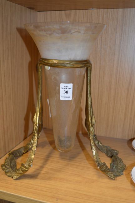 A brass stand containing a conical glass vase.