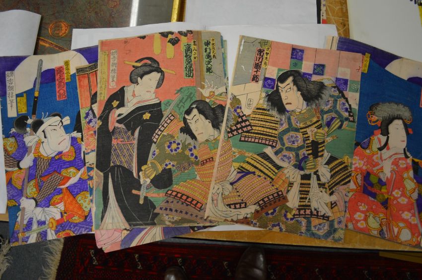 Three Japanese Meiji period triptych woodblock prints depicting Kabuki theatre plays, unframed.