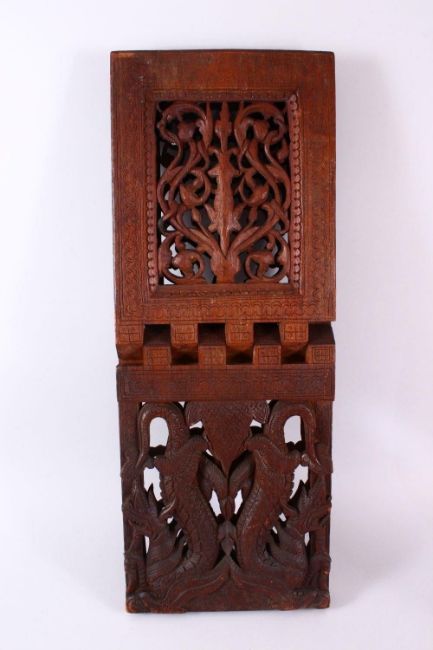A LARGE CHINESE SIAMESE CARVED WOODEN BOOK STAND, carved with openwork of mythical beast and floral panels, 76cm high ( closed ) 29cm wide.