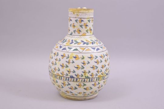 A TURKISH KUTAHYA GLAZED POTTERY WATER JUG, painted with foliate motifs, 20cm high.