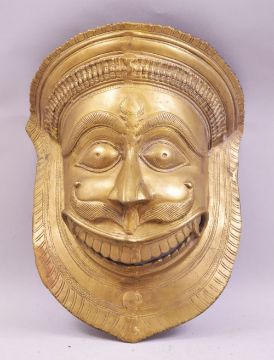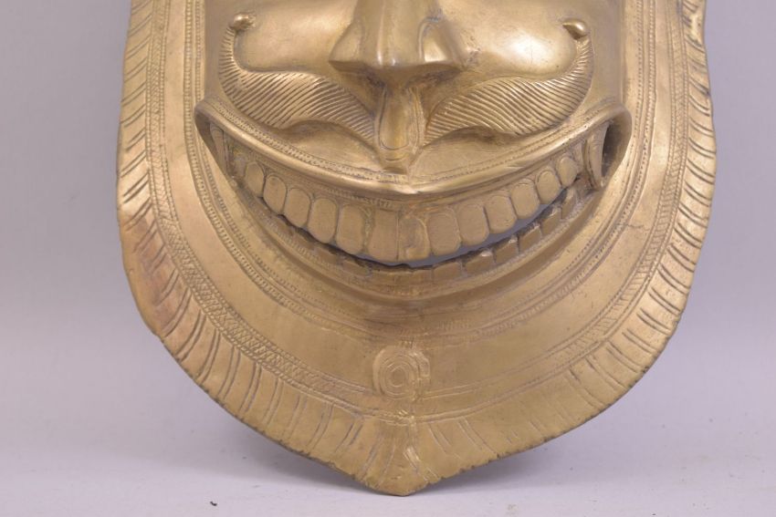 A LARGE 19TH CENTURY INDIAN BRONZE WALL MASK OF NARASIMHA / MAN LION; a fierce avatar of the Hindu god Vishnu who incarnates as part lion and part man to destroy evil and religious persecution on earth, the bronze mask with openwork mouth, mask 33cm x 26cm. Prov; from a private German collection.