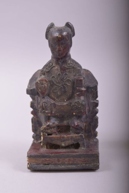 TWO 18TH CENTURY CHINESE CARVED WOODEN IMMORTAL FIGURES, 14cm and 13cm high.