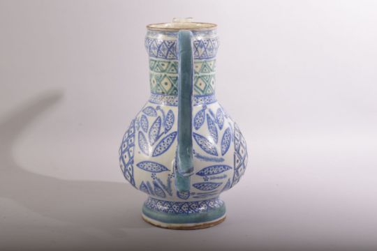 A TURKISH KUTAHYA GLAZED POTTERY WATER JUG, painted with blue decorative motifs, 24.5cm high.