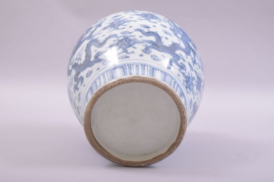 A CHINESE BLUE AND WHITE PORCELAIN JAR, painted with dragons and the flaming pearl of wisdom amongst stylised cloud form motifs, 23cm high.