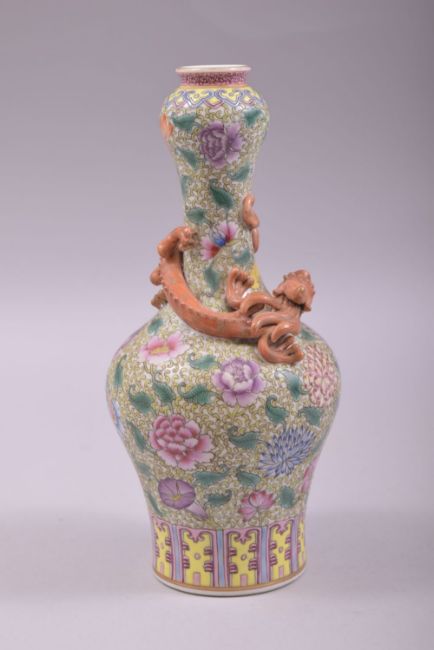 A SMALL CHINESE FAMILLE VERTE PORCELAIN BOTTLE VASE, with a coral red and gilt chilong curled around the neck, the body decorated with various flower heads, mark to base, 20.5cm high.