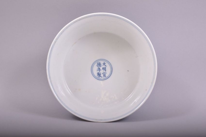 A CHINESE BLUE AND WHITE PORCELAIN BOWL AND COVER, decorated with dragons amongst stylised clouds, the inside lid with six character mark, the interior base of the bowl also with six character mark, 18.5cm diameter overall.