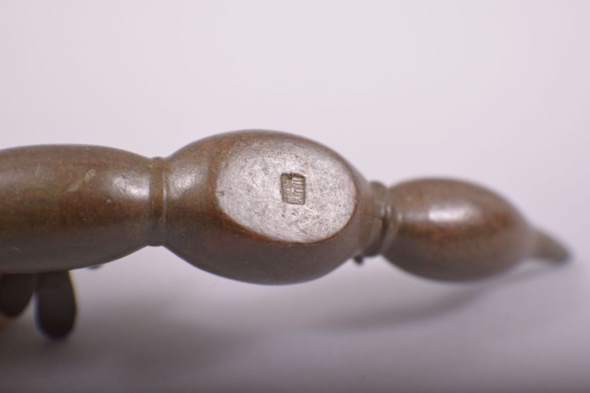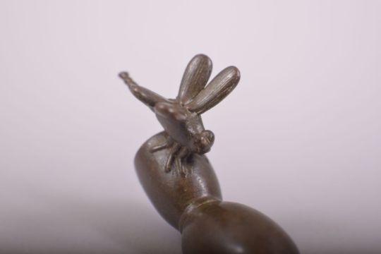 A JAPANESE BRONZE MODEL OF A DRAGONFLY ON A LOTUS ROOT, stamped underside, 9cm long.