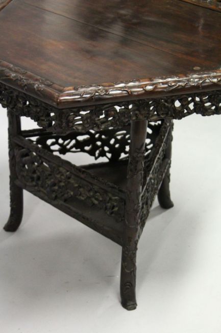 A GOOD CHINESE ROSEWOOD HEXAGONAL LOW TABLE, the removable top with carved rim and floral carved and pierced frieze, supported on a triangular shaped base with carved and pierced frame, 74cm diameter, 66cm high.