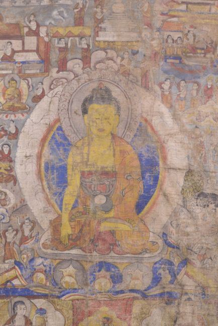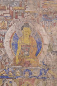 A FRAMED AND GLAZED TIBETAN THANGKA, overall size 92cm x 72cm.