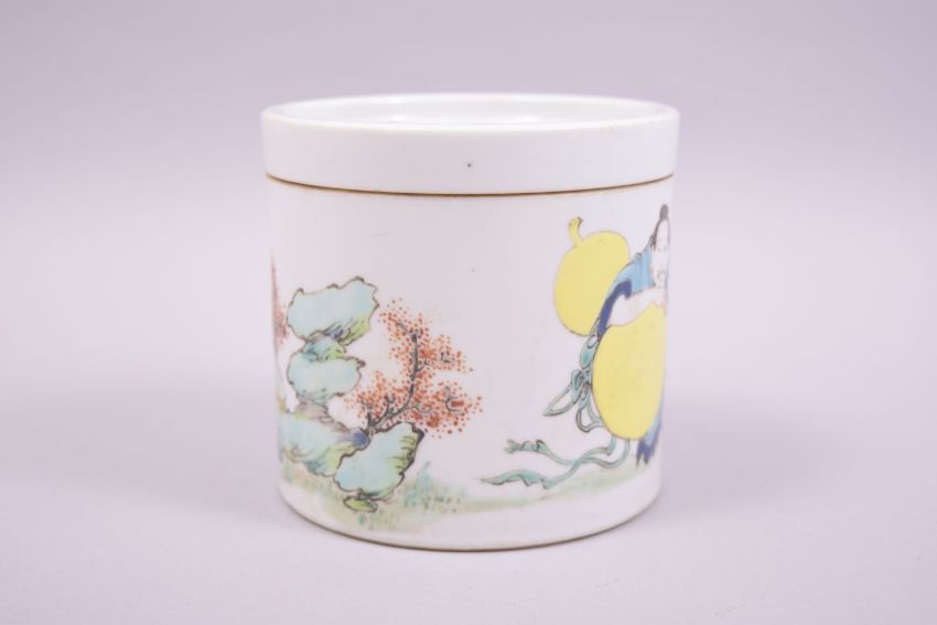 A CHINESE FAMILLE VERTE PORCELAIN BRUSH POT AND COVER, painted with a figure and a landscape, six character mark to base, overall 10cm high.