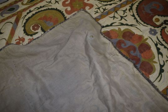 A 19TH CENTURY UZBEKISTAN SUZANI EMBROIDERED TEXTILE, the central with a floral star motif, with floral bloom borders, later backed, 190cm x 135cm.
