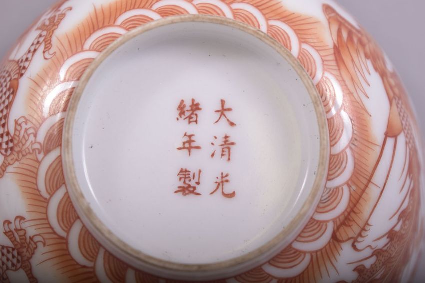 A SMALL PAIR OF CHINESE RED AND WHITE PORCELAIN BOWLS, each bowl decorated with a dragon and phoenix with the flaming pearl of wisdom amongst stylised smoke and flames beneath a band of greek key design, the base of each which six character mark, 11.5cm diameter, with fitted box.