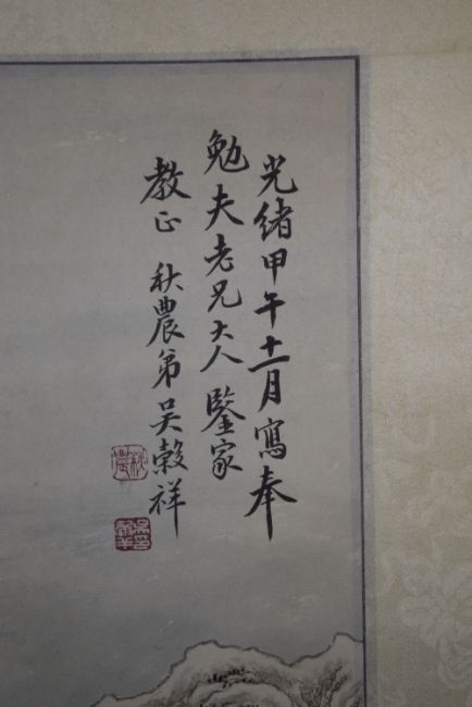 A GOOD CHINESE SCROLL PAINTING OF A MOUNTAINOUS LANDSCAPE, with a bridge over a river, trees and buildings beyond, the top right with calligraphy and red seal, image 69cm x 40cm, overall height when opened 182cm.