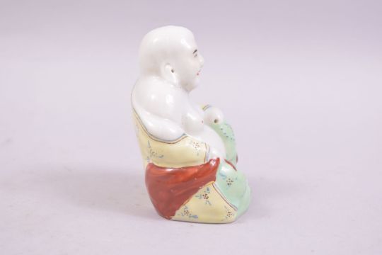 A SMALL PORCELAIN FIGURE OF A SEATED HOTEI, 8cm high.