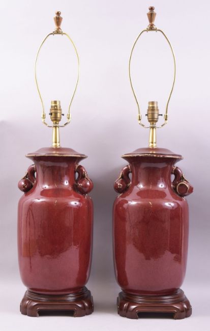 A GOOD LARGE PAIR OF CHINESE SANG DE BOEUF TWIN HANDLE LAMP VASES, the handles formed in the shape of fruit, both fitted with a wooden base, each approx. 78cm overall.