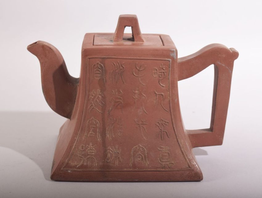 A CHINESE YIXING TEAPOT, with script to one side and mark to inner lid and base, 12.5cm high.