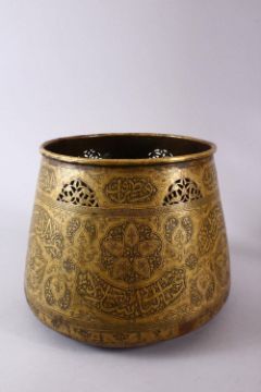 A 19TH / 20TH CENTURY SYRIAN BRASS CALLIGRAPHIC OPENWORK BOWL, decorated with round motif flora and shaped bands of calligraphy, 22cm