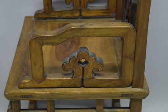 A CHINESE PIERCED AND CARVED WOODEN CHAIR, with shaped top rail and carved back section with a bat above fruit and leaves, supported on four scroll feet, the legs united by stretchers, 91cm high, 53cm wide, 40cm deep.