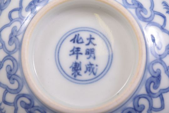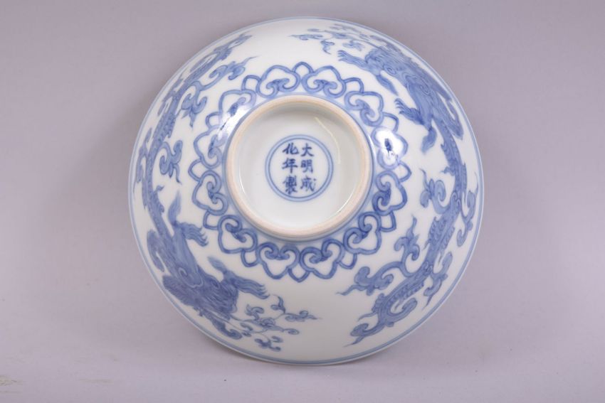 A CHINESE BLUE AND WHITE PORCELAIN BOWL, the exterior painted with mythical beasts, the interior base with lotus flower, six character mark to base, 15.5cm diameter.