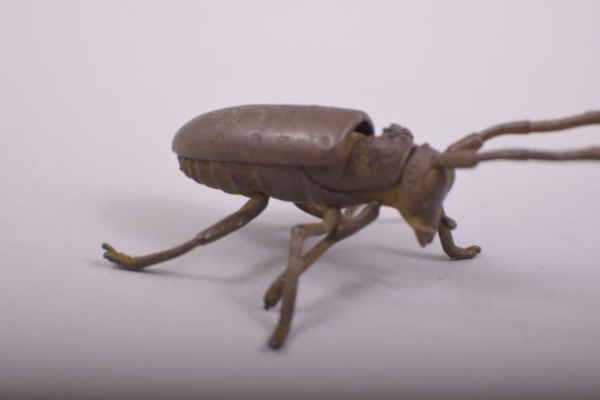 A JAPANESE BRONZE MODEL OF A LONG HORNED BEETLE, with hinged back, 14.5cm long.