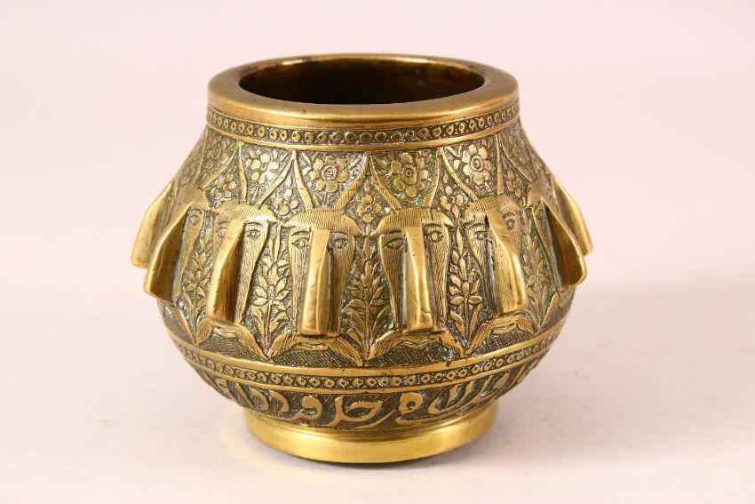 A 19TH CENTURY PERSIAN QAJAR ENGRAVED BRONZE MORTAR - with multi head decoration 12cm