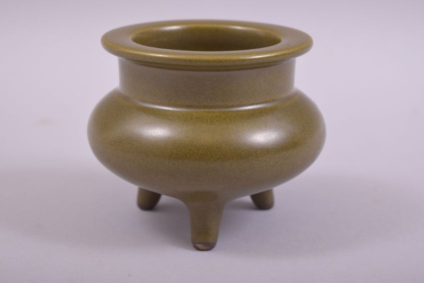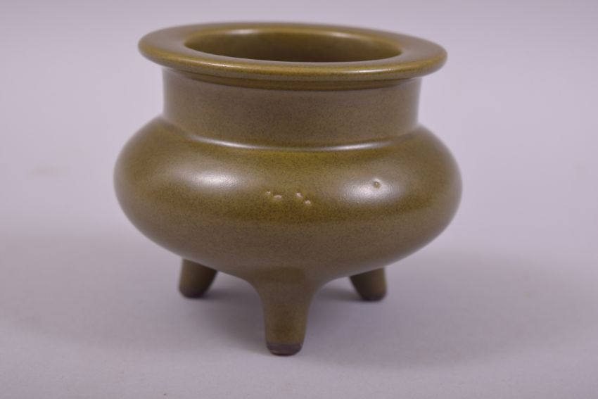 A SMALL CHINESE TEA DUST TRIPOD INCENSE BURNER, impressed mark to base, 7.5cm high.