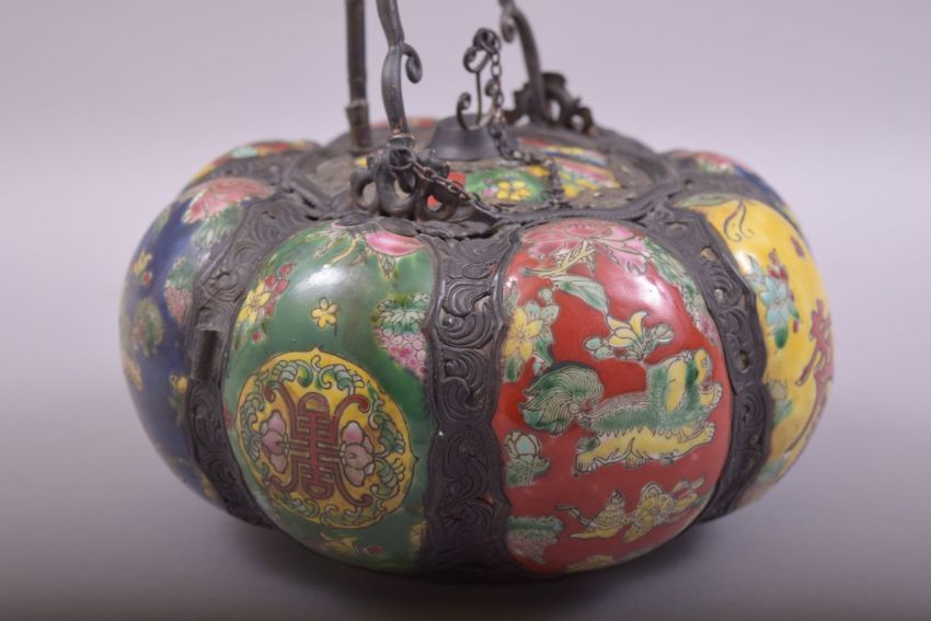 AN UNUSUAL CHINESE PUMPKIN FORMED PORCELAIN AND BRONZE OPIUM VESSEL, with eight porcelain panels depicting foo dogs and calligraphy, the base with a red dragon emblem with mark to the centre, approx. 20cm diameter.