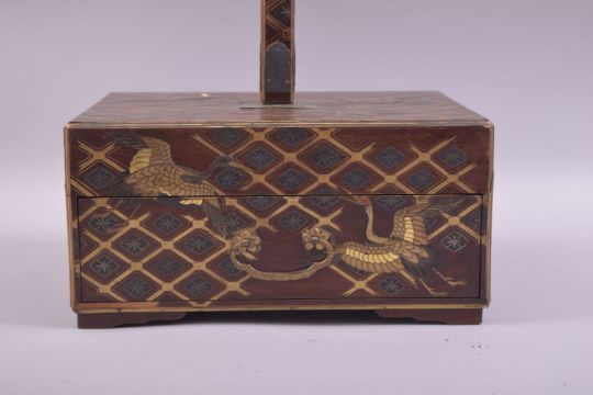 A JAPANESE WOOD AND LACQUER STAND, the base decorated with cranes and gilt latticework, the front containing a drawer, the base with a detachable support, 46.5cm high overall.