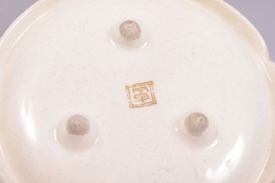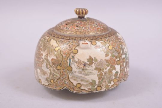 A JAPANESE SATSUMA PORCELAIN BOX AND COVER, decorated with panels of figures, landscapes, temples and birds with native flora, mark to base, 9cm diameter (af).
