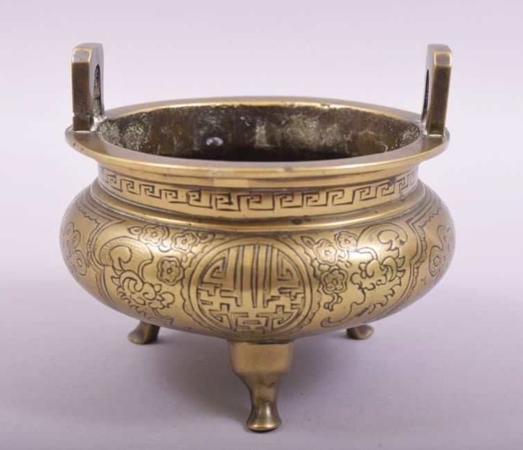 A CHINESE BRONZE TWIN HANDLE TRIPOD CENSER, with engraved and chased decoration, the base with six character mark, 11.5cm diameter.