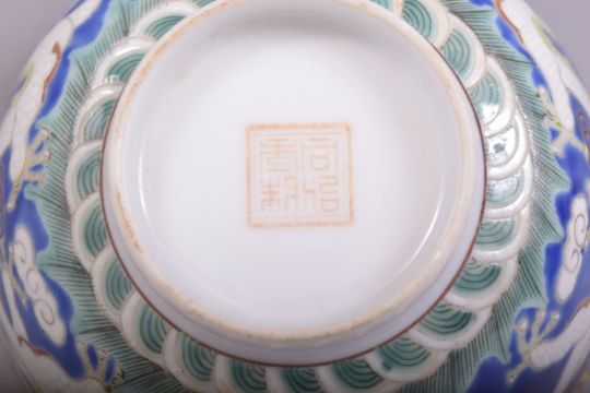 A SMALL CHINESE BLUE GLAZED PORCELAIN DRAGON BOWL, the bowl exterior incised and painted with two dragons and the pearl of wisdom, red mark to base, 11cm diameter, with a fitted box.