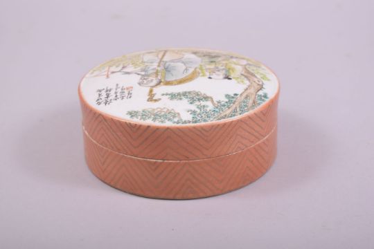 A CHINESE FAMILLE VERTE CIRCULAR PORCELAIN BOX AND COVER, the cover painted with two figures in an outdoor setting with script to upper right, four character mark to base, 12cm diameter.