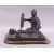 A GOOD JAPANESE BRONZE GROUP modelled as a lady kneeling beside a spinning wheel with a basket of yarn, together with a hardwood stand, bronze 27cm long, 23cm wide overall.
