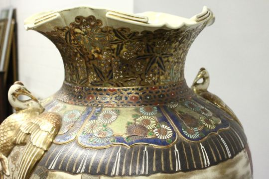 A HIGHLY IMPRESSIVE AND MONUMENTAL JAPANESE SATSUMA FLOOR STANDING VASE on a carved gilt wood stand, with moulded rim and chrysanthemum decorated shoulder, the handles moulded as stalks with wings out swept, painted with panels depicting sumo wrestlers, vase 106cm high, on stand 160cm. Prov. Kevin Page Antiques.