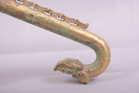 AN ARCHAIC STYLE CHINESE GILT JADE RITUAL AXE, with zoomorphic handle, 24cm long.