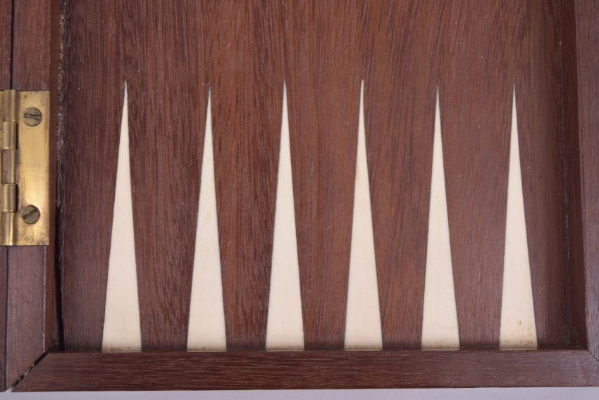 A SET OF CHINESE SIXTEEN STAINED RED AND SIXTEEN WHITE COUNTERS, 2.5cm, carved with figures and chess pieces in an inlaid chess and backgammon box.