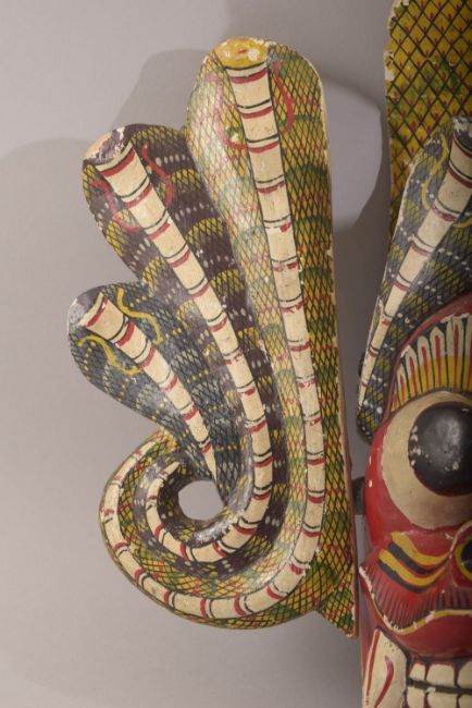 A LARGE SRI LANKAN CARVED AND PAINTED WOODEN MASK, 33cm x 45cm.